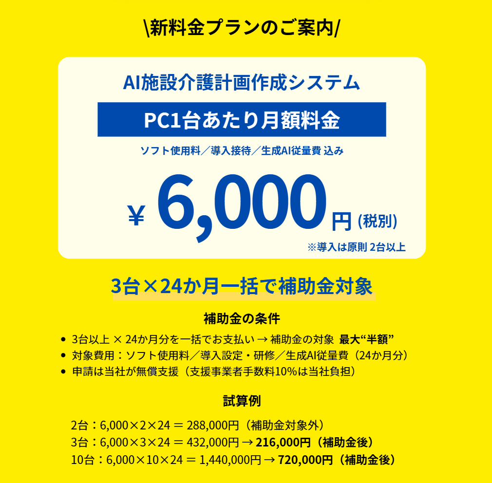 3台利用:6,000円 × 3台 × 24か月 = 432,000円 → 216,000円(補助金適用後)